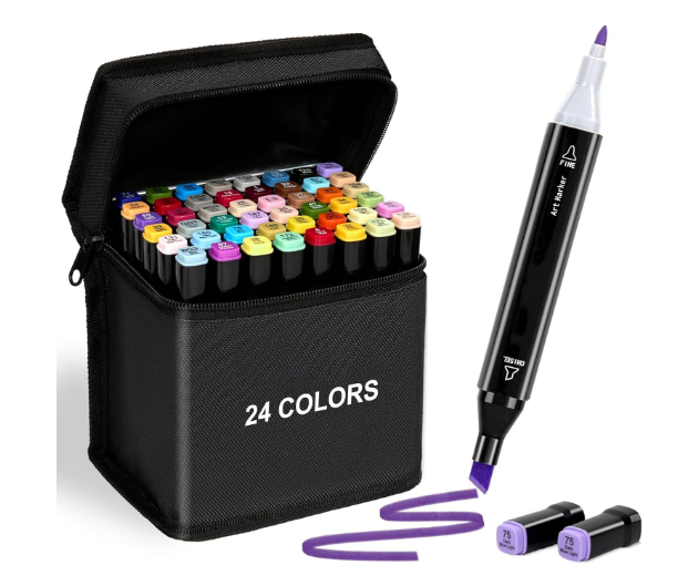 Cada marcador possui ponta dupla – fina (1mm) e chanfrada (6mm) – permitindo desde traços precisos até preenchimentos amplos. A tinta à base de álcool garante cores vivas, secagem rápida e ótima durabilidade, sem borrar ou manchar facilmente.