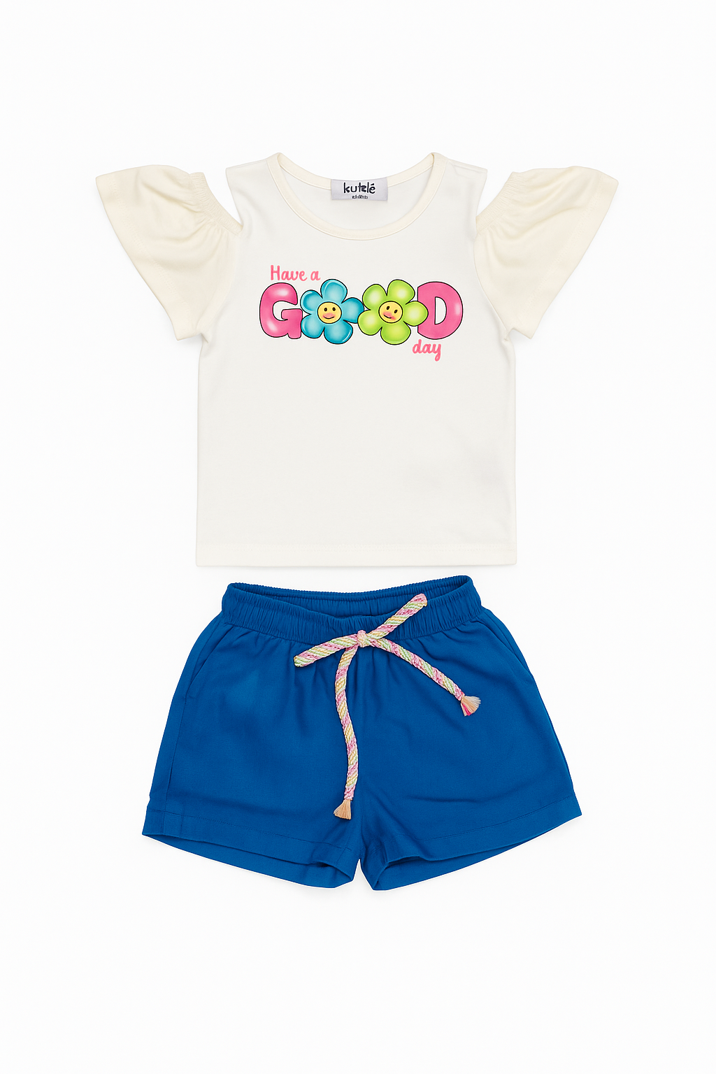 Conjunto Feminino Infantil Blusa Off e Short Sarja Azul - Kukie - Ref 93402