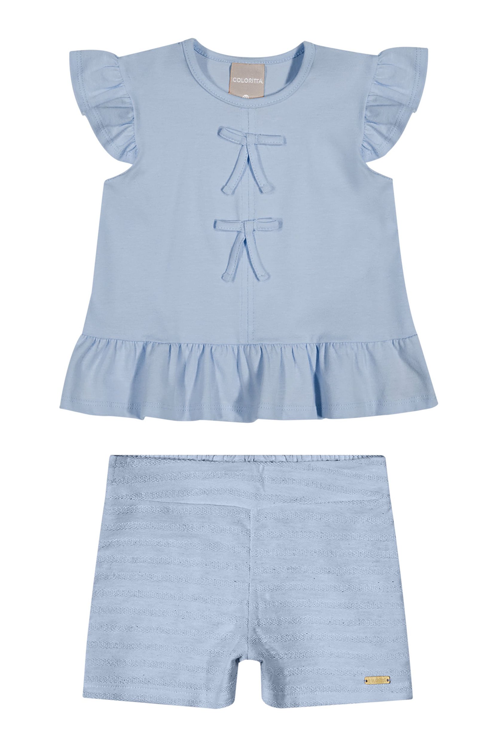Conjunto Feminino Infantil Bata Azul Clara com Laços e Short - Colorittá - Ref 73318