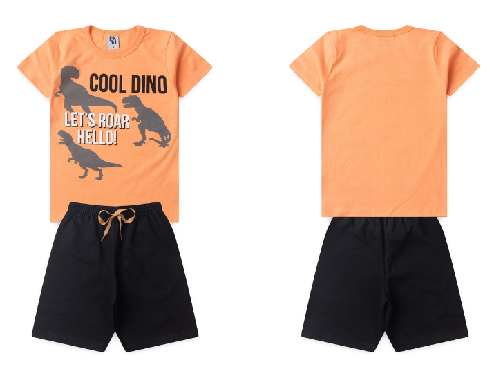 Conjunto Masculino Infantil Dinossauro - Camiseta Laranja e Bermuda Preta