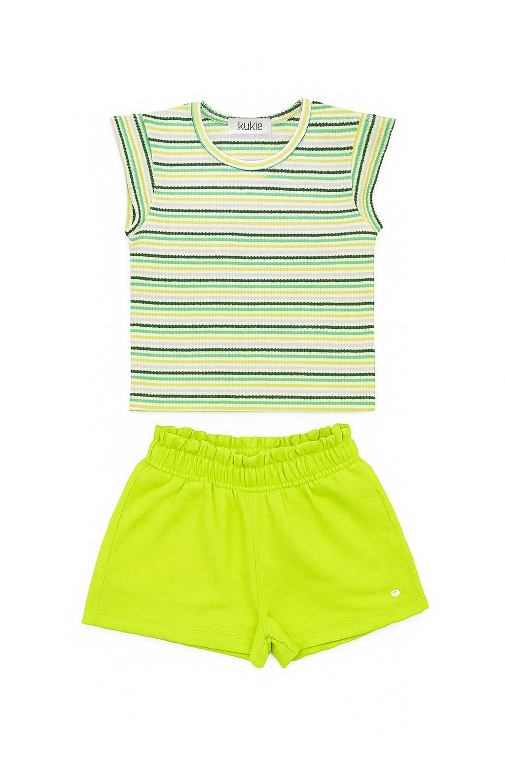 Conjunto de Blusa Boxy Over em Malha Canelada listrada e Short Verde Neon - Kukiê - Ref 93699